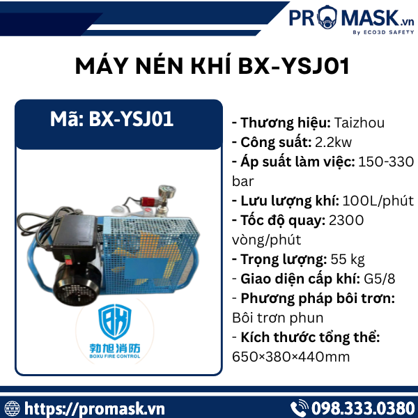 - Máy nén khí BX-YSJ01 có khả năng làm việc ở áp suất 150–330 bar, đáp ứng tiêu chuẩn nạp khí cao áp cho bình dưỡng khí SCBA và bình lặn chuyên nghiệp.