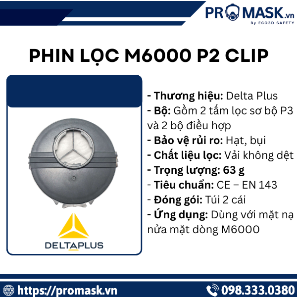 Phin lọc M6000 P2 CLIP là giải pháp lọc bụi mịn và hạt ô nhiễm rắn – lỏng ở mức trung bình, được thiết kế chuyên dụng cho hệ mặt nạ JUPITER M6000 của Delta Plus. Với cơ chế CLIP gài nhanh, sản phẩm giúp người dùng thay lắp dễ dàng, tiết kiệm thời gian và đảm bảo độ kín khít trong quá trình làm việc. Phin lọc M6000 P2 CLIP đạt tiêu chuẩn CE, EN143 P2NR, phù hợp sử dụng trong nhiều môi trường lao động phổ biến như sản xuất công nghiệp nhẹ, cơ khí, xây dựng hoàn thiện, nông nghiệp và xưởng bảo trì kỹ thuật.