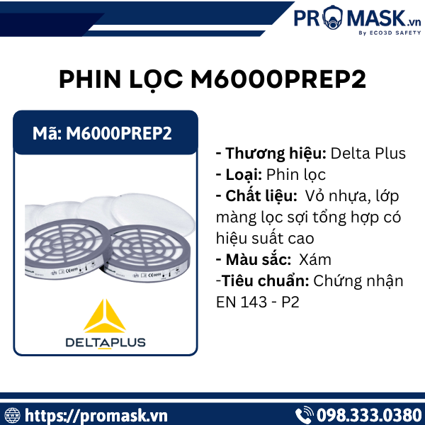 Phin lọc M6000PREP2 đến từ thương hiệu Delta Plus là lựa chọn tối ưu cho người lao động thường xuyên làm việc trong môi trường có nồng độ bụi vừa đến cao. Với khả năng lọc bụi mịn cấp độ P2, sản phẩm giúp ngăn chặn hiệu quả bụi mài, bụi gỗ, bụi kim loại, bụi công nghiệp và nhiều hạt nguy hại khác xuất hiện trong quá trình sản xuất – thi công.Phin lọc được thiết kế nhỏ gọn, dễ lắp đặt và tương thích hoàn hảo với mặt nạ dòng M6000, phin lọc M6000PREP2 mang đến sự an tâm, tin cậy và hiệu suất ổn định cho người sử dụng.