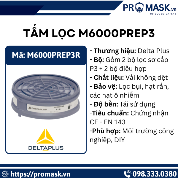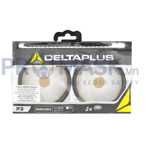 Phin lọc M6000PREP3 Delta Plus – Lớp tiền lọc P3 hiệu quả, ngăn bụi và hạt rắn, bảo vệ đường hô hấp. Phù hợp cho nhiều môi trường làm việc với khả năng tái sử dụng, dễ dàng lắp đặt.